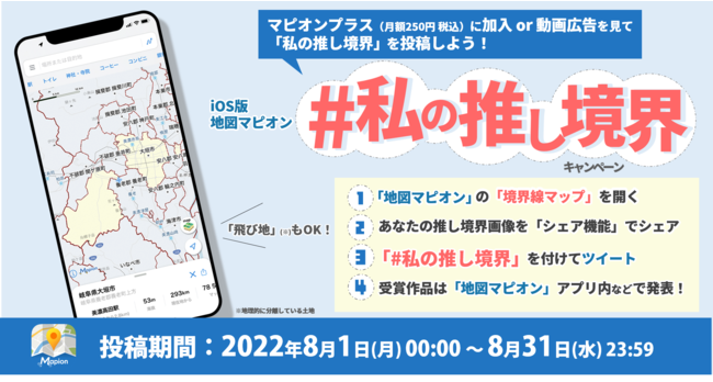 凸版印刷株式会社のグループ会社である株式会社ONE COMPATH(ワン・コンパス)が運営する地図アプリ「地図マピオン」(iOS版)は、2022年8月1 日(月)~8月31日(水)まで、Twitter投稿キャンペーン「#私の推し境界」キャンペーンを実施します。