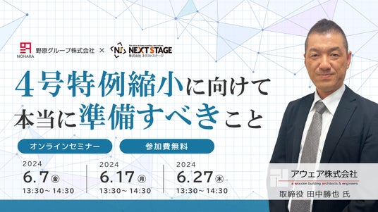 BuildAppで建設DXに取り組む野原グループ株式会社(本社:東京都新宿区、代表取締役社長:野原弘輔)は、BuildApp事業統括本部で戸建住宅向け事業を展開する住環境カンパニーが、株式会社 NEXT STAGE(本社:大阪府大阪市、代表取締役社長:小村直克)と2024年6月7日(金)、17日(月)、27(木)に住宅業界向けオンラインセミナー「4号特例縮小に向けて本当に準備すべきこと」を開催することをお知らせいたします。