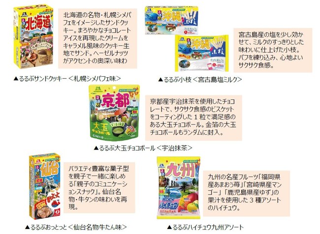 「小枝」「ハイチュウ」「おっとっと」など、当社を代表する人気商品を豊富なラインアップで取り揃え、北海道や京都・沖縄などの5ヶ所の人気エリアのご当地グルメとコラボレーションしています。さらに、各商品のパッケージには人気観光名所をあしらい、手に取るだけでわくわくするようなデザインにしました。おうちでも楽しい旅行気分を味わうことのできる商品の発売により、お客様に笑顔をお届けしてまいります。