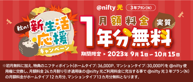 ニフティ株式会社(本社:東京都新宿区、代表取締役社長:前島 一就、以下当社)は、「秋の新生活応援キャンペーン」を本日9月1日(金)から実施します。