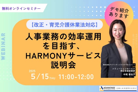 株式会社アドバンテッジリスクマネジメントは、2025年5月15日(木)に人事労務/両立支援のご担当者様・責任者様および産業保健スタッフを対象としたWebセミナー「【改正・育児介護休業法対応】人事業務の効率運用を目指す、HARMONYサービス説明会」を開催いたします。