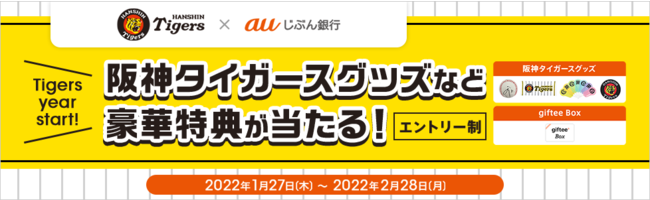 auじぶん銀行では、2022年1月から阪神タイガースのオフィシャルスポンサーとなったことを記念し、2022年1月27日から「阪神タイガース×auじぶん銀行 オフィシャルスポンサー開始記念キャンペーン」を実施中です。本キャンペーンは、キャンペーンにエントリーいただいたお客さまの中から、抽選で8,484名さまに、阪神タイガースグッズなどの豪華特典をプレゼントします。