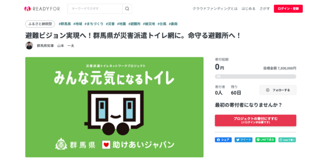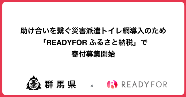 READYFOR株式会社(本社:東京都千代田区、代表取締役CEO:米良はるか)が運営する自治体向けクラウドファンディング「READYFOR ふるさと納税」にて、新たに群馬県がプロジェクトを開始いたします。クラウドファンディングを通じて集める寄付により、災害派遣トイレトレーラー導入します。