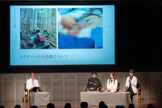 冒頭、元フライトドクターの松村医師から、ドクターヘリの活動内容や配備状況についての説明がされました。現場やヘリ内で展開される治療の緊迫した様子が実際の映像とともに伝えられ、ドクターヘリのリアルな活動実態と救急医療におけるその有効性が示されました。