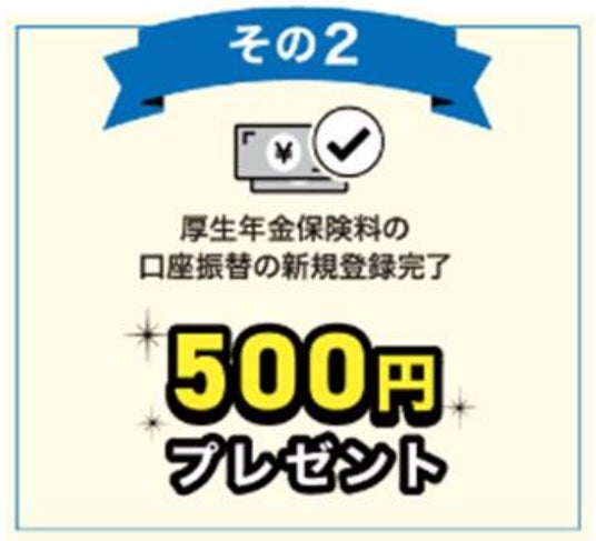 厚生年金保険料の口座振替の新規登録完了で、500円プレゼント