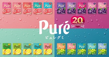 『ピュレグミ』は、2002年の発売以来、幅広い世代の方からご支持いただいているカンロの人気商品です。フルーツのおいしさを引き出す“すっぱいパウダー”と独自の“果肉食感”により、噛むほどにフルーティーな甘ずっぱいおいしさが広がり、食べた瞬間こころが晴れるように、ちょっとハート(気持ち)があがるハート型のグミです。ピュレグミは今年で20周年。「ときめく風に、乗れ。」というメッセージを通じて、みなさまのときめく気持ちを応援していきます。