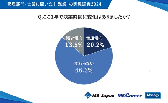 次に、1年での残業時間の変化を調査してみました。「変わらない」が66.3%と多くを占める一方で、「増加傾向」の20.2%が「減少傾向」の13.5%を上回る結果となりました。