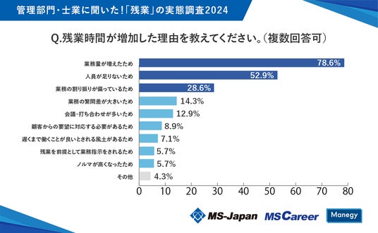 最も多かったのは「業務量が増えたため」の78.6%、次点で「人員が足りないため」52.9%、「業務の割り振りが偏っているため」28.6%が続きました。