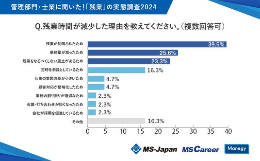 割合が多い順に、「残業が制限されたため」39.5%、「業務量が減ったため」25.6%、「残業をなるべくしない風土があるため」23.3%という結果でした。