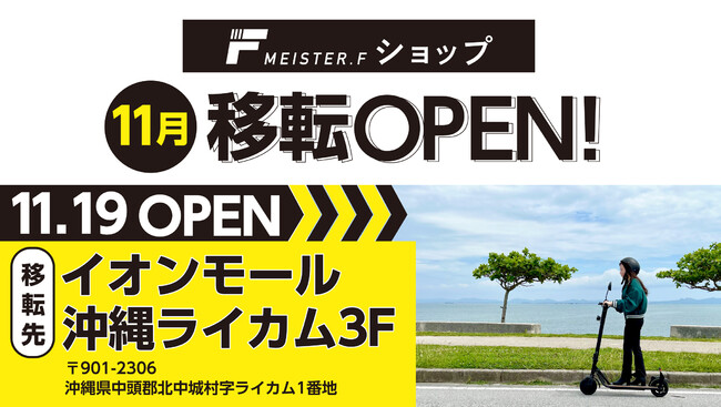 株式会社FUGU INNOVATIONS JAPANが運営する、パーソナルモビリティブランド「MESTER.F(マイスターエフ)」がイオンモール沖縄ライカム3階に2022年11月19日(土)移転オープンいたします。