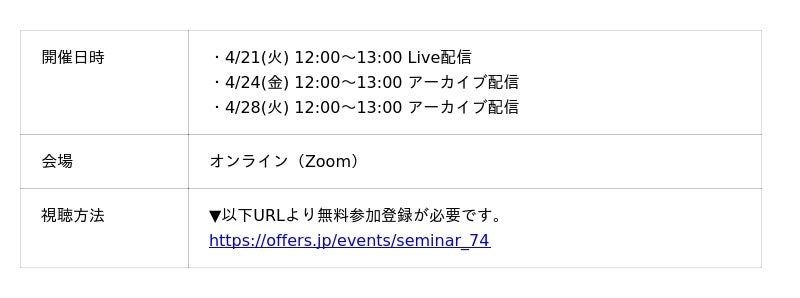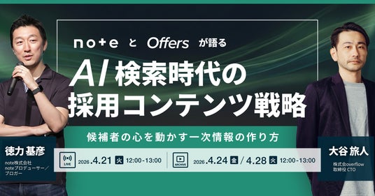AI時代のエンジニア転職プラットフォーム「Offers(オファーズ)」を運営する株式会社overflow(本社:東京都港区、代表取締役:鈴木裕斗、以下 overflow)は、「AI検索時代の採用コンテンツ戦略 ~noteとOffersが語る候補者の心を動かす一次情報の作り方~」を2026年4月21日(火)にライブ配信、4月24日(金)、4月28日(火)にアーカイブ配信いたします。