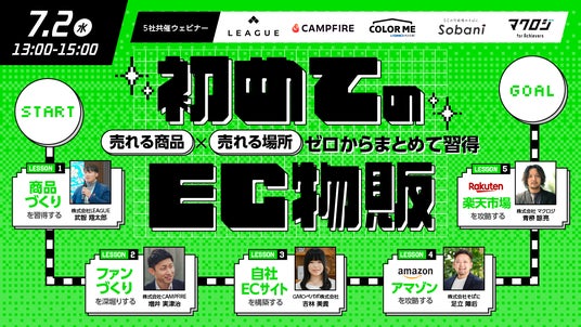 株式会社LEAGUE(本社:東京都)は、株式会社CAMPFIRE(本社:東京都)、GMOペパボ株式会社(本社:東京都)が運営するECサイト構築サービス「カラーミーショップ byGMOペパボ」、株式会社そばに(本社:大阪府)、株式会社マクロジ(本社:福岡県)と共催で、未経験でも成果を出せるEC参入の新常識を体系的に学べる無料オンラインセミナー「初めてのEC物販~売れる商品×売れる場所、ゼロからまとめて習得~」を2025年7月2日(水)13時から開催いたします。