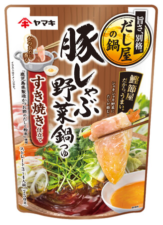 「旨さ、別格。だし屋の鍋」シリーズは、「鰹節屋・だし屋、ヤマキ。」だからこそ作れる、だしにこだわり、だしのうま味を活かした鍋つゆです。その中でも「豚しゃぶ野菜鍋つゆ」は、豚肉と野菜をおいしく手軽に食べることができるシリーズで、現在4商品を展開し発売以来人気を誇っています。