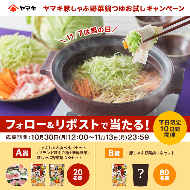 ヤマキ株式会社(本社:愛媛県伊予市 代表取締役社長:城戸善浩 以下 ヤマキ)は、11 月7 日(火)の鍋の日を前に、10 月30 日(月)よりX(旧Twitter)にて「ヤマキ豚しゃぶ野菜鍋つゆお試しキャンペーン」を実施します。