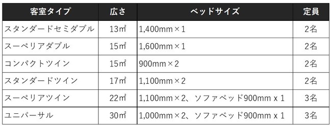 【客室】シンプルで機能的な6タイプ。開業記念の特別料金プランもあります。※料金は変動するので公式サイトでご確認ください。