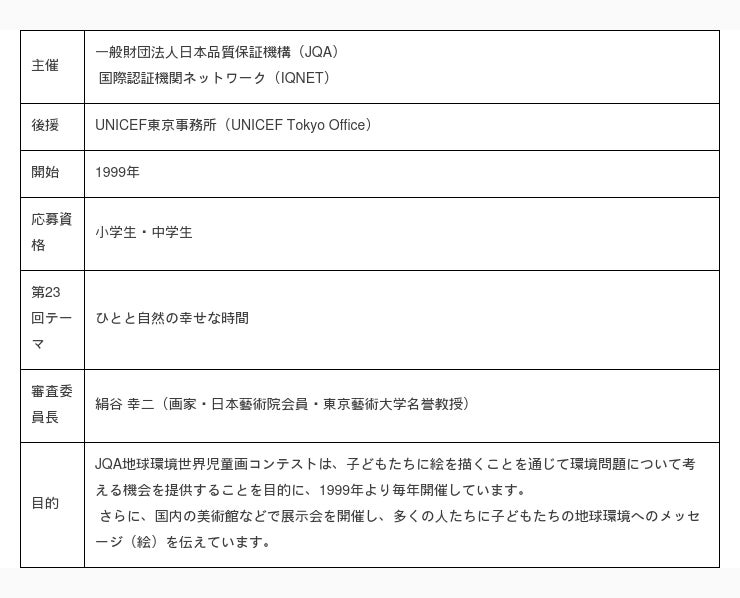 一般財団法人日本品質保証機構(東京都千代田区、理事長:石井 裕晶、略称:JQA)と国際認証機関ネットワーク(スイス・ジュネーブ、略称:IQNET)が主催し、UNICEF東京事務所(東京都渋谷区)の後援による「JQA地球環境世界児童画コンテスト」は、1999年より開催しております。