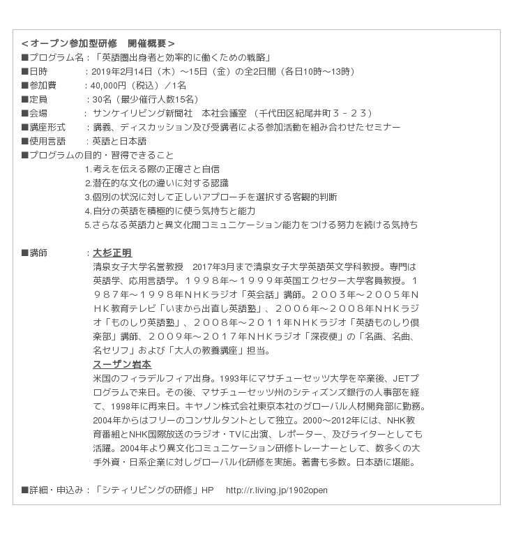 サンケイリビング新聞社(東京都千代田区 代表取締役社長 中村史朗)では、オフィスで働く女性のための情報紙「シティリビング」のオフィス事業「シティリビングの研修」で新たな研修プログラム「英語圏出身者と効率的に働くための戦略」をリリースしました。