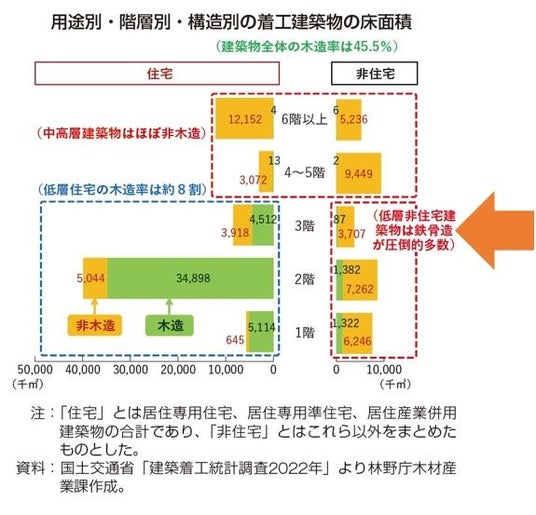 中大規模の木造建築は、森林資源の循環やCO2排出量削減など世界的な課題であるカーボンニュートラル実現に大きく寄与することから世界中から注目が集まっていることは前述の通りです。しかし、日本国内における1年間の着工建築物全体の木造率は45.5%に留まっており、非住宅建築物や中高層建築物のほとんどは木造以外の構造で建築されています。