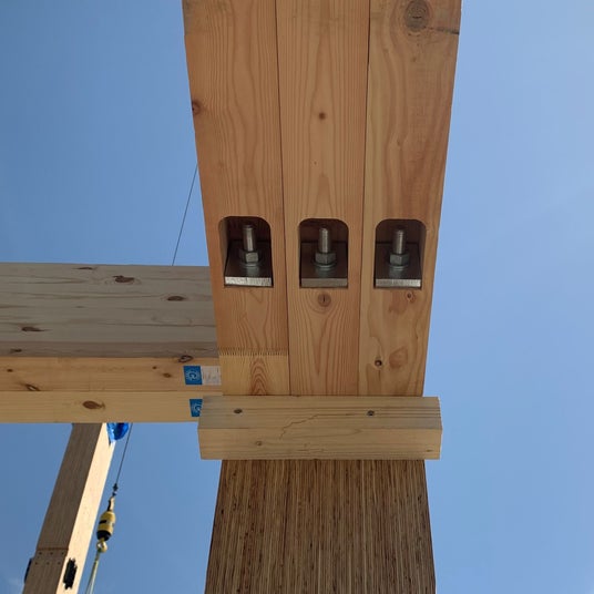 ●世界に誇る伝統の匠の技(木組みの技術)を駆使し、要求される耐火性能を担保しながら、多くの構造部材を「あらわし」で実現。一般的なビルでは免震装置を使うケースもあるが、今回の建物は木組みの構造体だけで設計施工。市販品で賄えないものについては、一部オリジナルで開発した部資材を活用。その中で最大耐力を誇る耐力壁は今までに類を見ない住宅用耐力壁の16倍に相当。耐荷重は300kNで軽自動車30台分の重量に耐えられる強度。