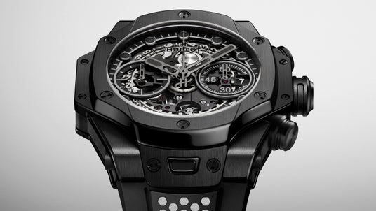 この時計は、サテン&ポリッシュ仕上げを施したブラックセラミック製の42mmケースを採用し、「ビッグ・バン」シリーズの特徴である大胆なジオメトリーとモジュラー構造を反映しています。オールブラックのセラミック仕上げを選択したことで、SR_Aは洗練されたミニマルな美学へと回帰しています。