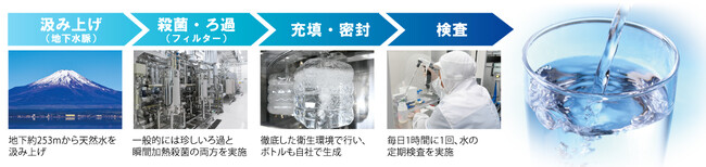 富士山のふもとから汲み上げられる質の高い天然水を自社工場で責任をもって製造し、採水から最短24時間以内に出荷。新鮮なお水をお客様へお届けできるよう取り組んでいます。