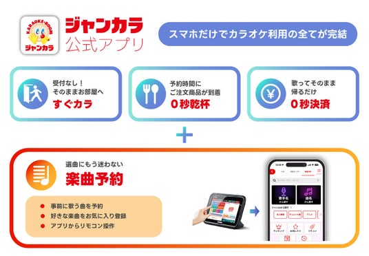 従来の「すぐカラ」「0秒乾杯」「0秒決済」機能に加えて、今回「楽曲予約」機能がジャンカラ公式アプリに追加されることで、お持ちのスマホでご予約から入店・退店までのカラオケ利用が全て完結することとなります。