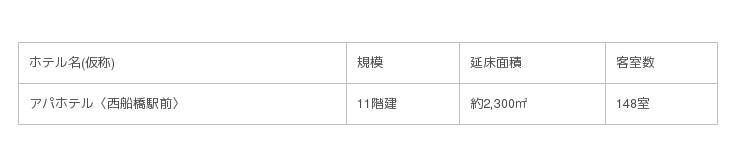 本案件は、JR総武線・武蔵野線・京葉線、東京メトロ東西線、東葉高速鉄道東葉高速線の5路線が乗り入れる千葉県内最大の交通の要所である、「西船橋」駅より徒歩2分の駅前立地となる。「海浜幕張」駅(幕張メッセ)まで12分、「舞浜」駅(東京ディズニーリゾート(R))まで13分と乗換なしでアクセスでき、千葉県内の各方面のみならず、都内へのアクセスも至便であることなどから、ビジネスやレジャーの拠点に適した立地となる。本案件地では11階建、全148室のアパホテル〈西船橋駅前〉の建設を計画し、2021年2月の開業を目指す。概要は下記の通り。