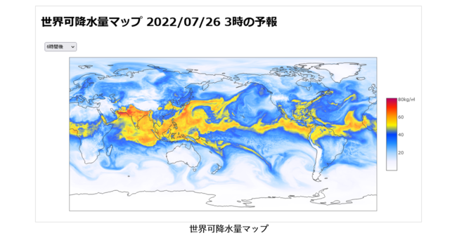 6時間ごとに168時間後(7日後)までの可降水量の予報を見ることができます。日本はもちろん世界全体の可降水量を固定された地図上で確認できます。