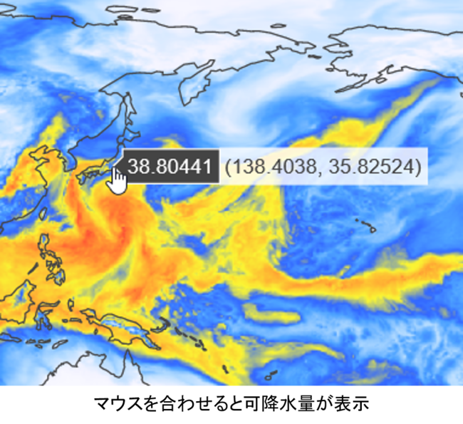 マウスカーソルを合わせると経度(0°~360°)/緯度(-90°~90°)とともに、その場の可降水量がポップアップで表示されます(ポップアップ機能は右上の「Toggle show closest data on hover」アイコンをクリックするとoffにできます)