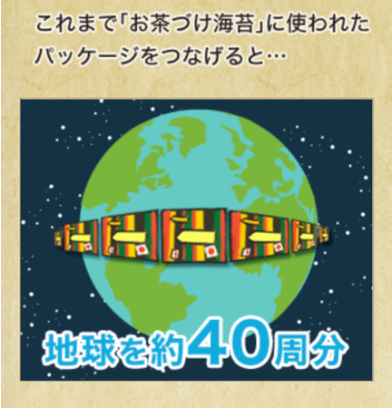 「お茶づけ海苔」といえば、歌舞伎の定式幕をイメージしたパッケージが印象的ですが、これまで食べられた小袋(1食分の袋)を縦につなげると、地球一周どころか約40周分に到達しています。