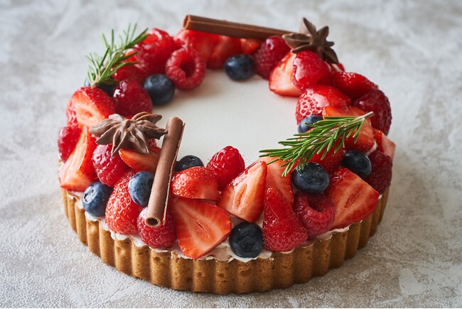 ブルーベリーを、リースをイメージして贅沢にトッピング。サクサクのタルトと甘酸っぱいベリー、口どけの良いバニラムースの味わいをお楽しみいただけます。