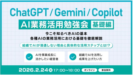 ChatGPTなどの基礎から、具体的なビジネス活用事例までを分かりやすく解説する勉強会を開催します。すでに400人以上が受講し、その効果を実感しています。ChatGPTなどの生成AIをビジネスのインフラとして活用し、業務効率化を図りたい方は、ぜひご参加ください。