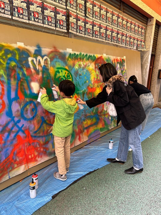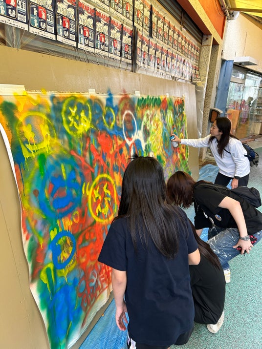 ミューラル(MURAL)とは日本語で「壁画」という意味で、壁や床の利用許可を得て描かれるストリートアートの一種です。今回のプロジェクトでは、国内外の6人のアーティストが沖縄市のコザ銀天街を舞台に、ミューラルを制作いたしました。完成披露イベントであるミューラルフェス「WRAP UP OKINAWA 2025」は、「沖縄の未来をアートで包み込む」をテーマに掲げ、地元のミュージシャンやダンサー、飲食店の協力を得ながら4月5日に開催されました。本財団も、地元の方々と共にミューラルワークショップを実施いたしました。