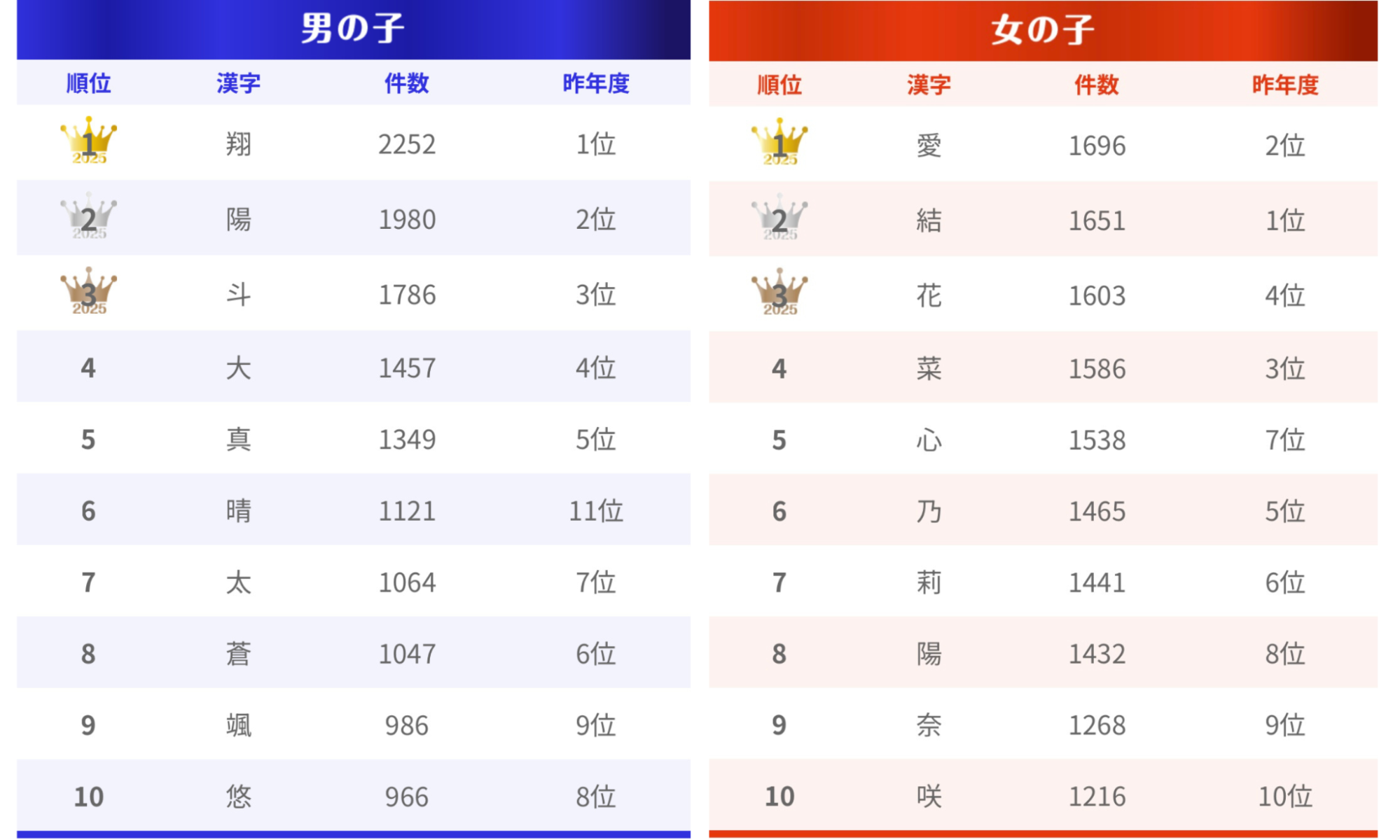 2025年生まれの赤ちゃん 名前の漢字ランキングTOP10