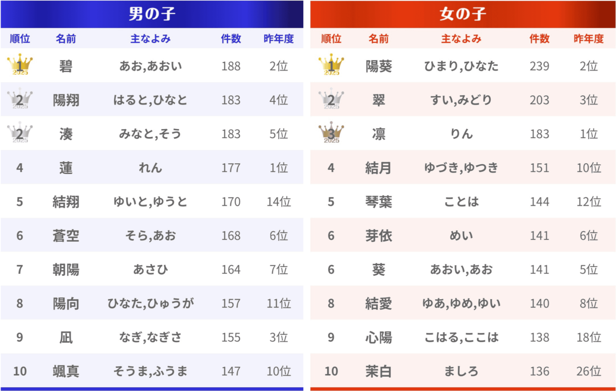 一方、女の子の名前ランキングTOP3は、1位「陽葵(主なよみ:ひまり)」、2位「翠(主なよみ:すい)」、3位「凛(主なよみ:りん)」という結果に。「陽葵」と「凛」は安定した人気を維持しており、近年注目度が高まっている「翠」は2位へと順位を伸ばしました。
