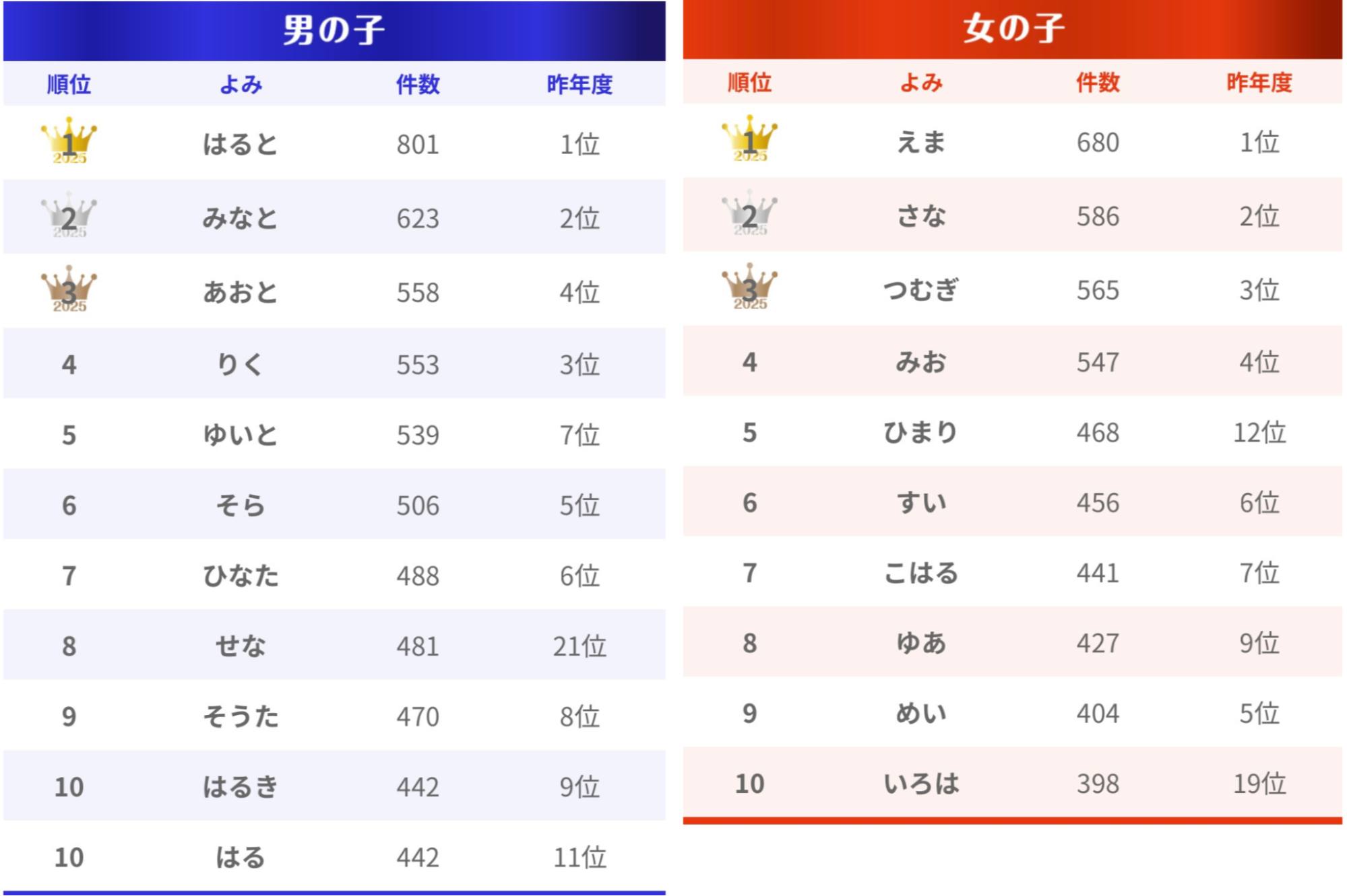 一方、女の子の名前 よみランキングTOP3は、1位「えま」、2位「さな」、3位「つむぎ」という結果に。また、明るく愛らしいイメージの「ひまり」は、2023年15位、2024年12位から2025年は5位へと順位を上げ、注目度が高まっています。