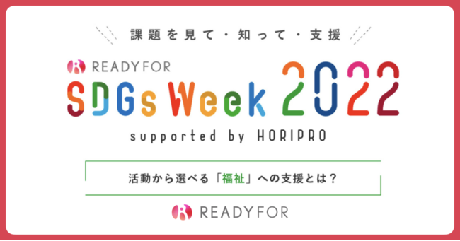 READYFOR株式会社(本社:東京都千代田区、代表取締役CEO:米良はるか)は、2022年9月16日(金)よりウェブイベント「課題を見て・知って・支援 READYFOR SDGsWeek 2022 supported by HORIPRO ~活動から選べる『福祉』への支援とは?~」を開催いたします。