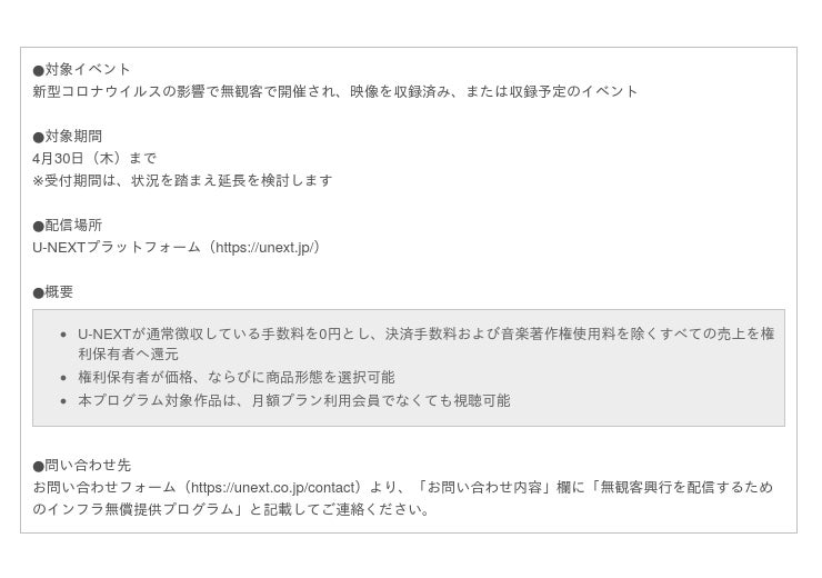 U-NEXTはエンターテイメントを配信する企業として、また、音楽・ライブ・舞台を愛する者として、新型コロナウイルスによる興行への中止・延期を痛ましく感じております。イベントを心待ちにしていたファンの方に向けて無料配信が相次ぐなか、U-NEXTは興行主・アーティスト、およびイベントに関わるすべての方をサポートしたいという思いのもと、自社の配信インフラを無償提供いたします。