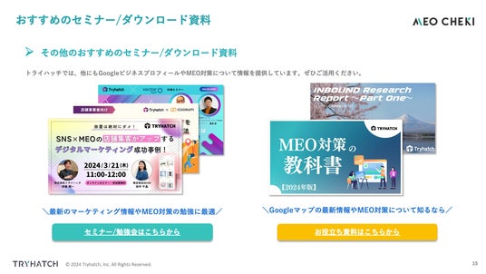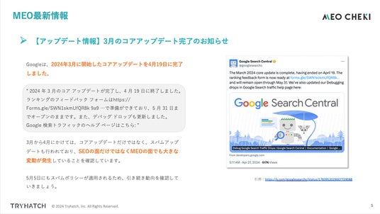 株式会社ベクトル(本社:東京都港区、代表取締役会長兼社長:西江 肇司、東証プライム:6058)の子会社である株式会社トライハッチ(東京都新宿区、代表取締役社長、武藤 尭行、以下「当社」)は、独自開発している店舗向けデジタルマーケティングツール「MEOチェキ」を活用して、MEOのアルゴリズム調査やトレンドをまとめた「MEOトレンドレポート」の2024年4月版を無料公開いたしました。