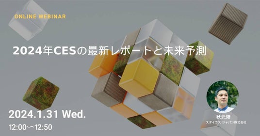 本ウェビナーでは、世界中のマーケット潮流をリサーチ・レポートするイノベーションアドバイザリー「STYLUS」の秋元陸氏をゲストに迎え、2024年のCES開催内容から「AIの産業適用」や「ウェルネス分野でのテクノロジー活用」など、今年の注目分野についていち早くレポート。