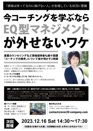 企業や20代に対し外部メンタリング事業を提供する株式会社OVER20&Company. (本社:東京都港区、代表取締役:石堂里佳・糸井達哉 / 以下「OVER20」)は、2023年12月16日(土) に代官山・蔦屋書店2F にてコーチ・キャリアコンサルタント向け、稼げるスキルを獲得するためのセミナー「【稼ぐ力】今コーチングを学ぶなら「EQ型マネジメント」が外せないワケ」を開催します。