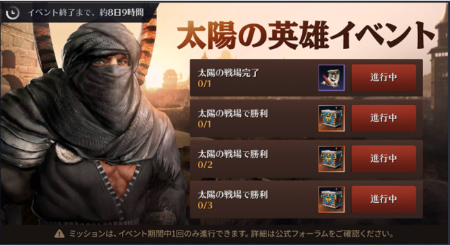 太陽の戦場に参加、勝利して報酬を獲得する、「太陽の英雄イベント」が開催。
