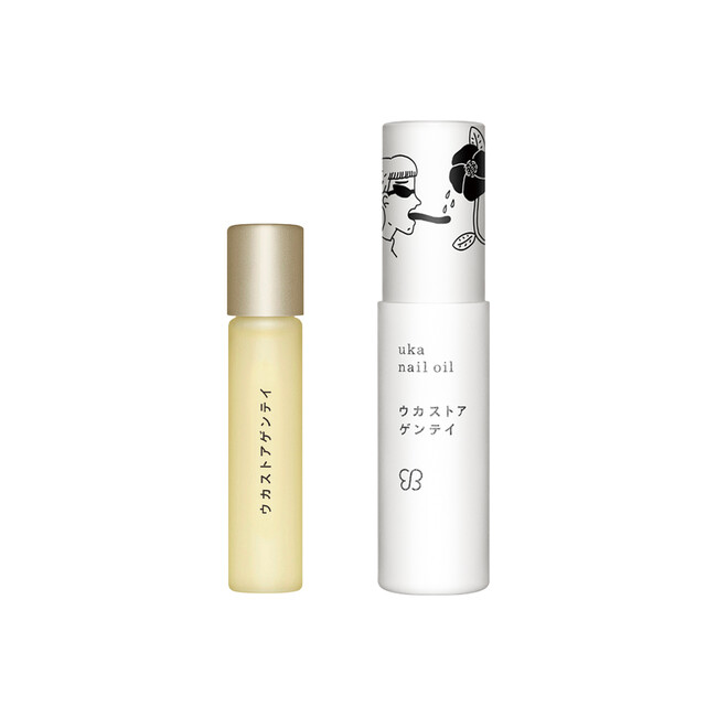 ストアオープンに合わせてつくられるウカストアゲンテイの商品。今回のカラーは「uka スカルプブラシ ケンザン ミディアム ウカストアゲンテイ メンタイレッド」。ウカストア共通カラーである白×黒の「uka ネイルオイル ウカストアゲンテイ」も並びます。