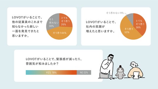 実際に、『LOVOT』導入企業からは、「LOVOTは仕事の合間に癒しの時間や息抜きを提供してくれる存在」「LOVOTを迎えたことにより社内の笑顔が増えた」「LOVOTをきっかけに人が集まり会話が生まれるきっかけになった」といった声をいただいており、「愛でる存在」である『LOVOT』がいることで従業員のストレス低減とウェルビーイング向上につながっています。