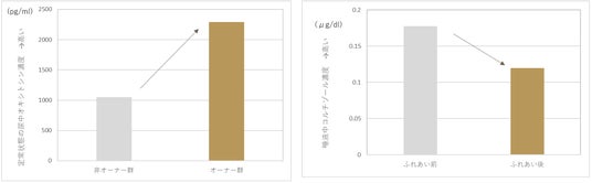 株式会社資生堂との実証実験では、『LOVOT』と共同生活するオーナーは絆形成ホルモン”オキシトシン”が高いことが判明。さらにオーナー/非オーナーを問わず『LOVOT』との15分の触れ合いでコルチゾールが減少し、ストレスの低下をもたらす結果になることがわかりました。