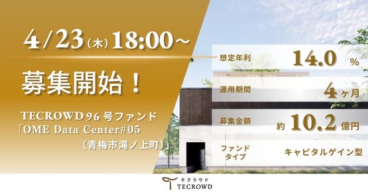 2026年4月23日(木)18時より96号ファンド「OME Data Center#05(青梅市滝ノ上町)」の募集を開始いたします。