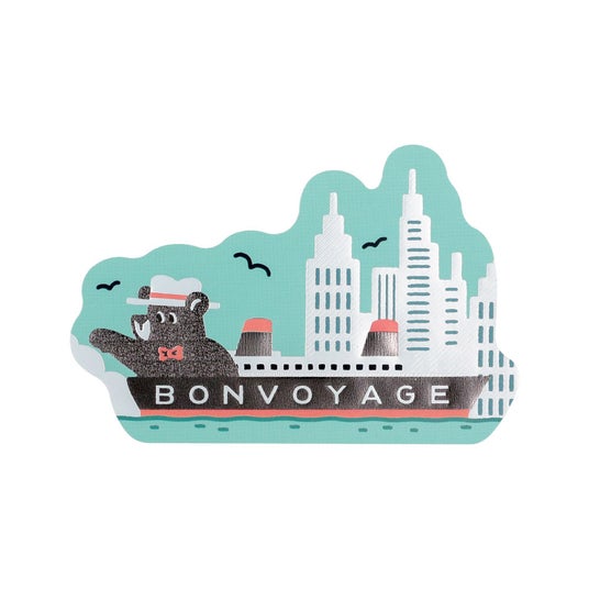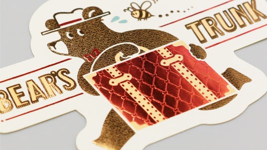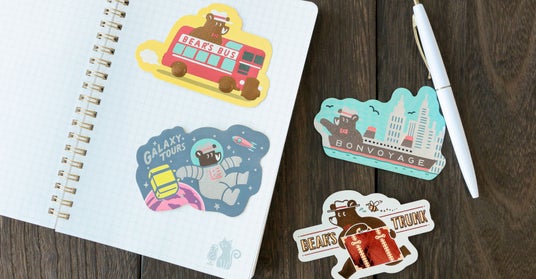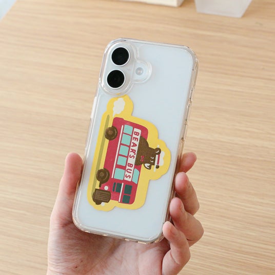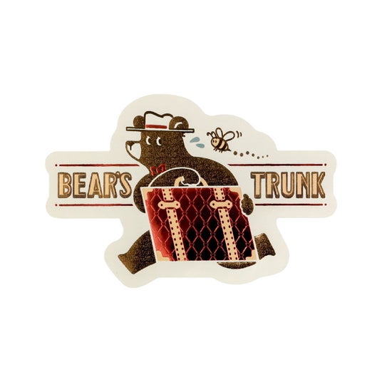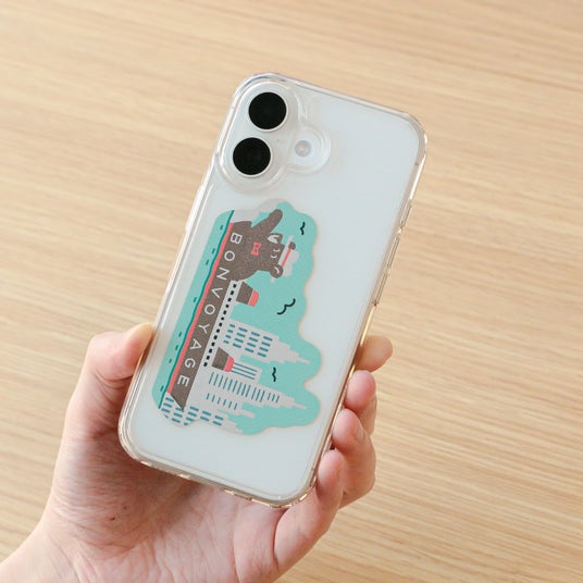 旅を続けるクマのワンシーンを、きらきらと輝く箔押しが彩るダイカットステッカーです。