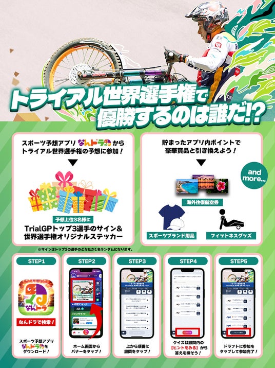 イノベーションの力で新たなスポーツ・エンターテインメントを創造し、まだ見ぬ感動と熱狂を提供するアプリ「なんドラ」を運営する株式会社なんでもドラフト(本社:東京都渋谷区、代表:森井啓允)は、5月17(土)・18日(日)モビリティリゾートもてぎにて行われる、『2025 Hertz FIMトライアル世界選手権 第3戦 大成ロテック日本グランプリ』の5月18日(日)開催・DAY2における、TrialGP(最高峰クラス)、Trial2(セカンドクラス)、TrialGP Women(女性クラス)の優勝予想企画を開催します。