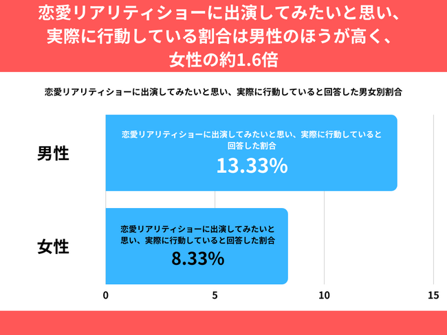 恋愛リアリティショーに出演してみたいと思い、実際に行動していると回答した割合を男女別でみてみますと、男性が13.33%、女性が8.33%という結果になりました。