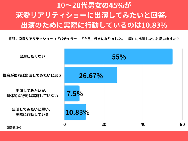10~20代男女を対象とした「恋愛リアリティショー(「バチェラー」「今日、好きになりました。」等)に出演したいと思いますか?」というアンケートで最も多かった回答は「出演したくない」で55%でした。